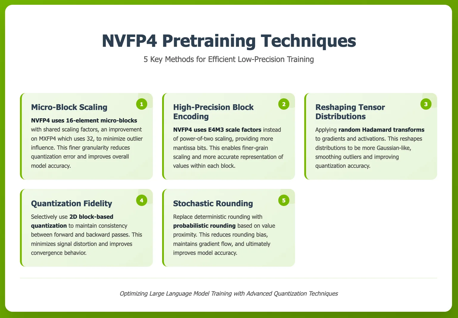 - GEMM operations consume FP4 tensors as inputs and produce outputs in BF16 or FP32.
