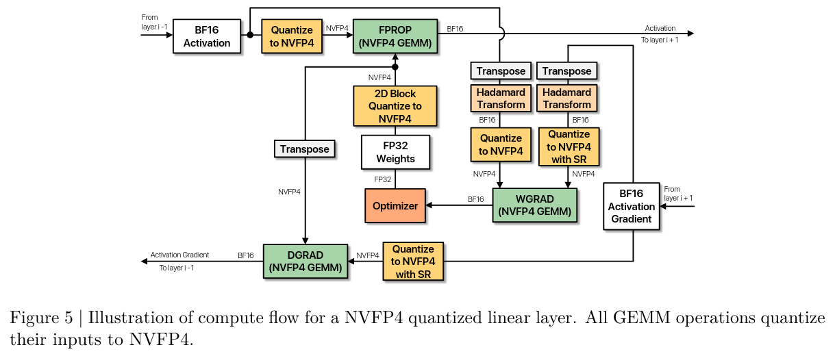 - Use two-dimensional (2D) scaling over 16×16 blocks for weights, and one dimensional scaling over 1×16 blocks for activations and gradients.