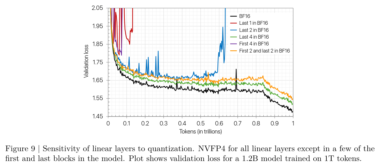 Although linear layers are typically computed in narrower precisions, we observe that some linear layers are more sensitive to FP4 than others.