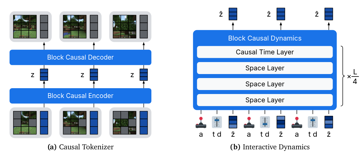 - Both components are causal in time, enabling temporal compression while maintaining the ability to decode frame by frame for interactive inference.