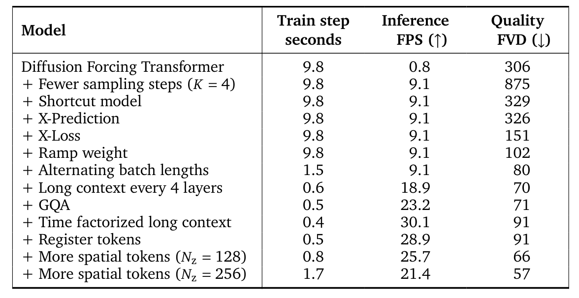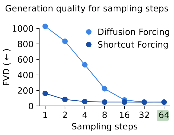 - With 64 sampling steps per frame, the baseline falls short of real-time generations with only 0.8 FPS on one H100 GPU, while 4 sampling steps achieve 9.1 FPS but result in poor quality