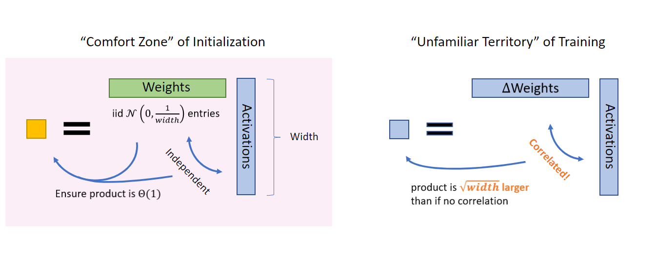 When a matrix W∈Rn×n multiplies with an activation vector x∈Rn to produce a pre-activation vector, we calculate a coordinate by taking a row from the matrix W, multiplying it by x coordinate-wise, and summing the coordinates of the resulting vector. When W’s entries are initialized with zero mean, this summation is across roughly independent elements with zero mean. As such, this sum would be n smaller than what it would be if the elements had nonzero mean or were strongly correlated, due to the famous square root cancellation effect underlying phenomena like the Central Limit Theorem.