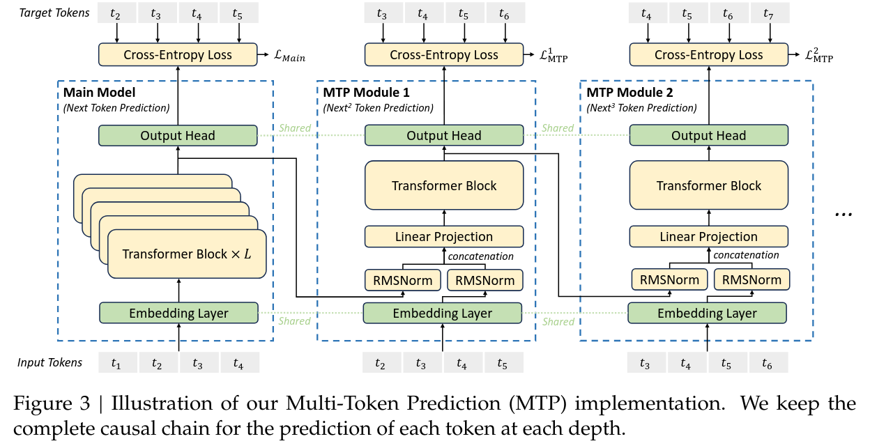 - Different from Gloeckle et al. (2024), which parallelly predicts 𝐷 additional tokens using independent output heads, they sequentially predict additional tokens and keep the complete causal chain at each prediction depth.