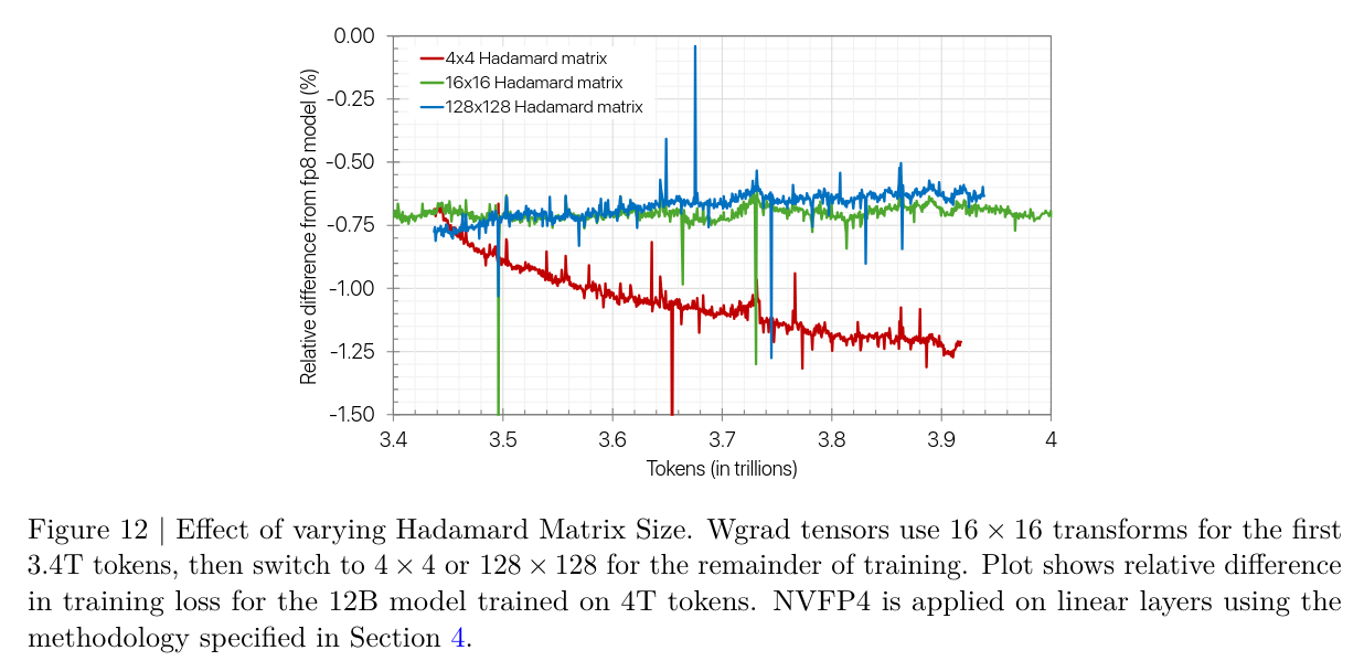 - Apply Random Hadamard transforms of size 16×16 to inputs of weight gradient GEMMs.