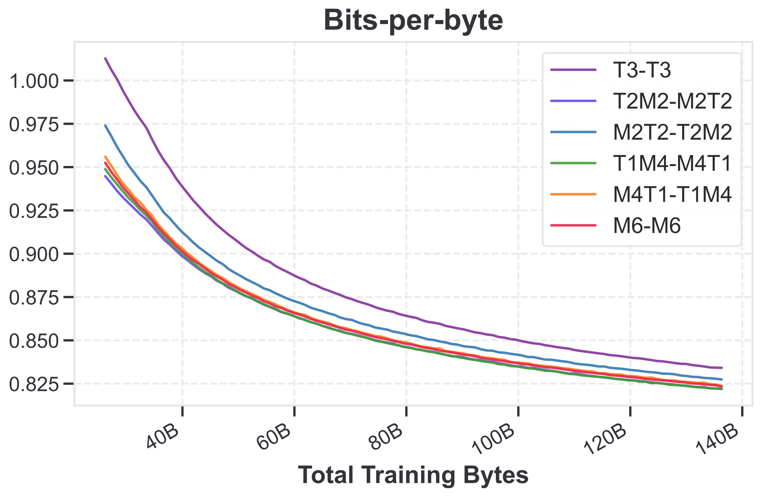 This figure shows a 1-stage H-Net trained on top of standard BPE-tokenized inputs, with T2M2-M2T2 for example denoting 2 Transformer layers and 2 Mamba layers in the encoder (and the reverse in the decoder). Note that Transformer layers are 2x the size of Mamba layers here, so everything is parameter/compute matched.