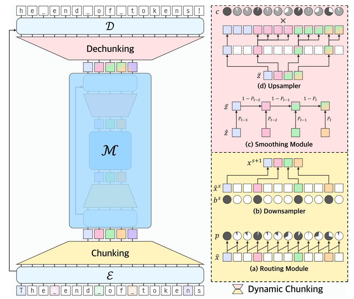 - By combining these with a new auxiliary loss function that targets desired downsampling ratios, and modern techniques for gradient-based learning of discrete choices (Switch Transformers and STE), DC lets an H-Net learn how to compress data in a fully end-to-end fashion.