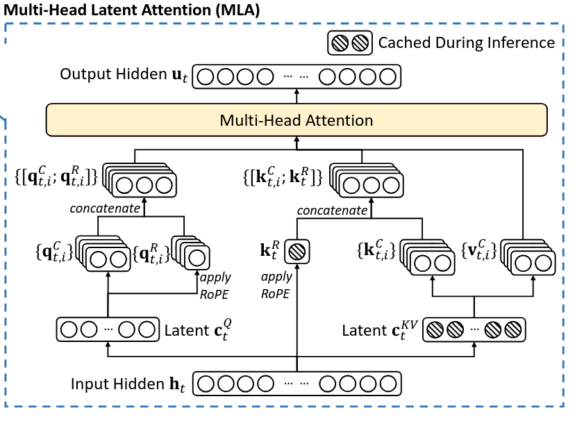 MLA utilizes low-rank key-value joint compression to eliminate the bottleneck of inference-time key-value cache.