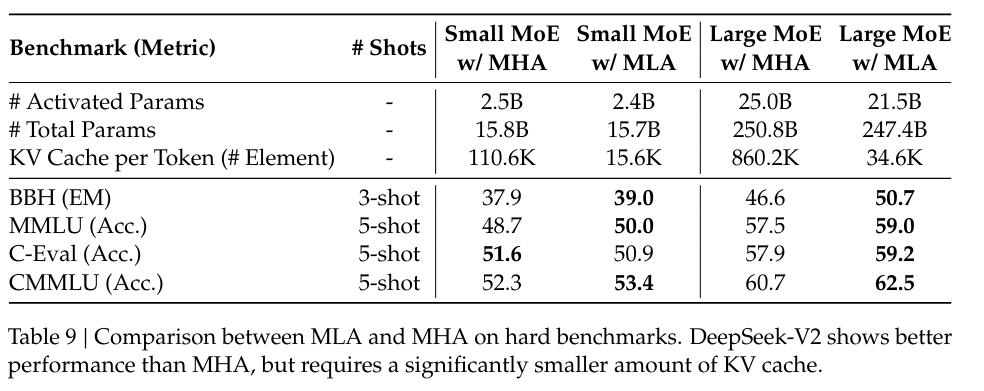 The amount of KV cache is measured by the number of elements, regardless of the storage precision. For DeepSeek-V2, is set to and is set to . So, its KV cache is equal to GQA with only 2.25 groups, but its performance is stronger than MHA.