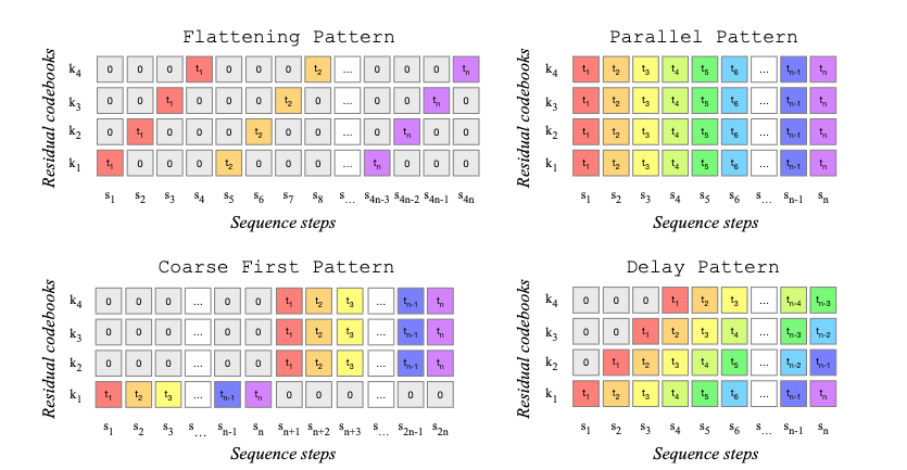 You could also predict all RVQ levels for a single step at once (”parallel pattern”), but it also makes things harder for the model because it has to decide on all levels at once.