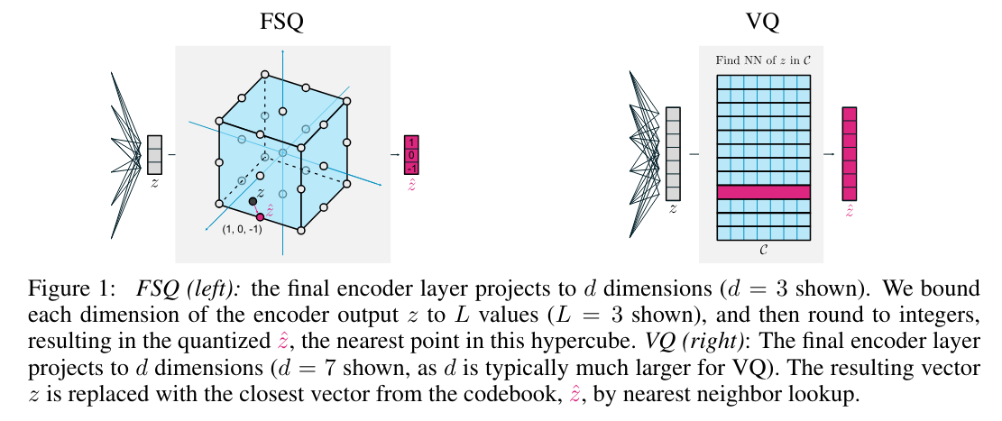 Consider a vector with channels. If we map each entry to values (e.g., via followed by rounding to integers), we obtain a quantized , where is one of unique possible vectors. The first figure shows FSQ for , implying a codebook , where .