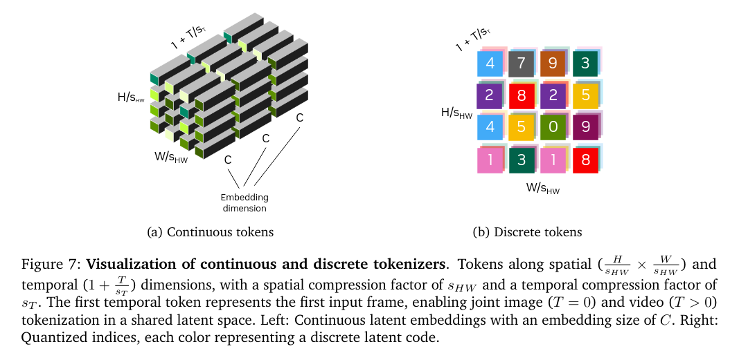 - Continuous tokenizers encode visual data into continuous latent embeddings, as in latent diffusion models